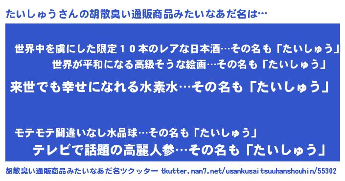 | ヘコむあだ名 | 『たいしゅう(遠い目)』『なまこ酢』 |