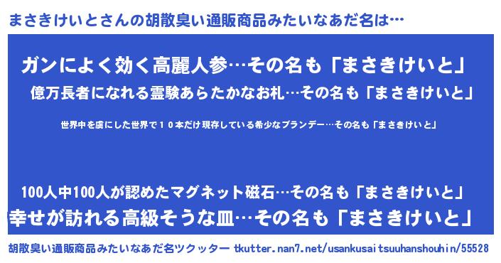 | 意味不明あだ名 | 『住所不定無職まさきけいと(79歳)』 |