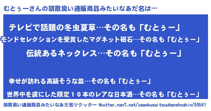 | ヘコむあだ名 | 『むと太郎』『なまこ酢』『むともー』 |