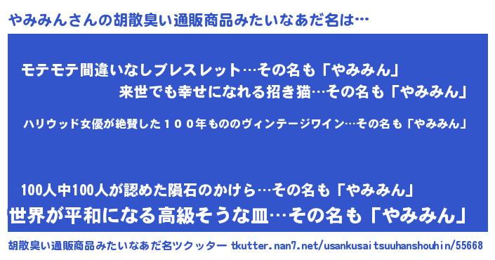 | 男性向けラノベタイトル風あだ名 | 『ヤミミンスレイヤー』『やみみんの憂鬱』 |