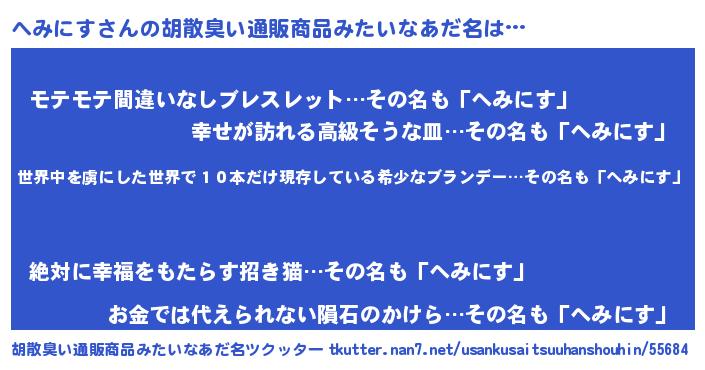 | 意味不明あだ名 | 『住所不定無職へみにす(71歳)』 |