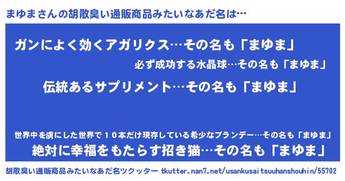 | 欧米人風あだ名 | 『ウサインまゆま』『アンジェラ・まゆま』 |