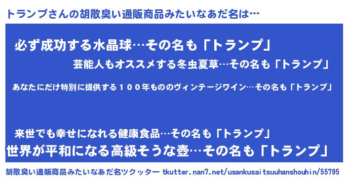 | 意味不明あだ名 | 『住所不定無職トランプ(2歳)』 |