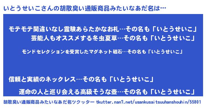 | ヘコむあだ名 | 『いとにー』『豆乳』『いと太郎』 |
