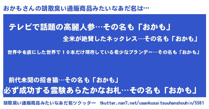 | 意味不明あだ名 | 『住所不定無職おかも(86歳)』『自称おかも』 |