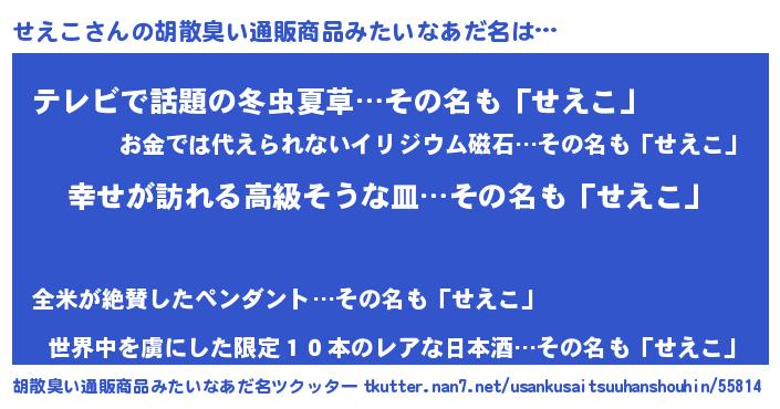 | 女子向けラノベタイトル風あだ名 | 『せえこの雑貨屋さん』『せえこ恋絵巻』 |