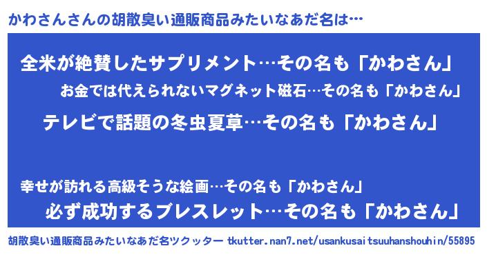 | 男性向けラノベタイトル風あだ名 | 『Re:かわさんから始める異世界生活』 |