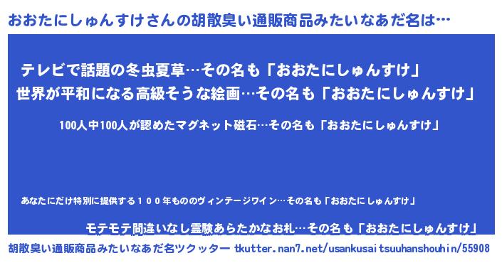 | 男性向けラノベタイトル風あだ名 | 『おまえをオタクにしてやるから、俺をおおたにしゅんすけにしてくれ! 』 |