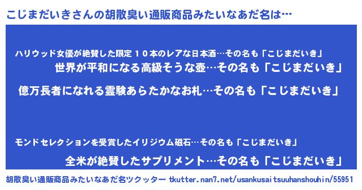 | 男性向けラノベタイトル風あだ名 | 『こじまだいき~年齢イコール彼女いない歴の魔法使い~』 |
