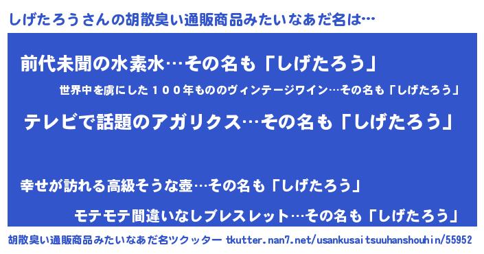 | 男性向けラノベタイトル風あだ名 | 『Re:しげたろうから始める異世界生活』 |