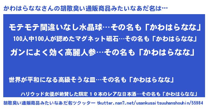 | ヘコむあだ名 | 『かわにー』『なまこ酢』『かわお』 |