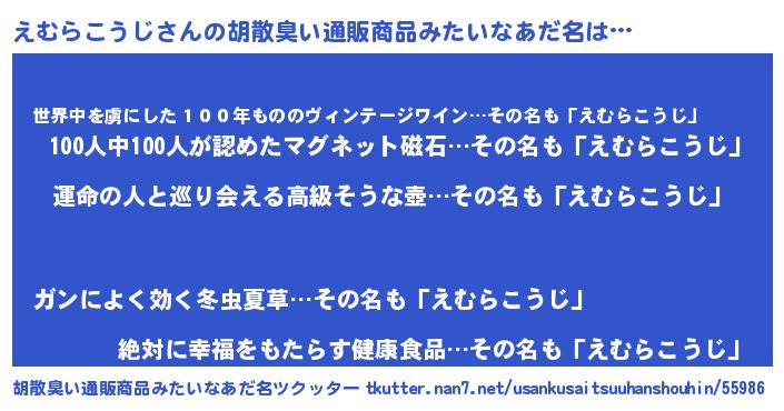 | 男性向けラノベタイトル風あだ名 | 『えむらこうじ~年齢イコール彼女いない歴の魔法使い~』 |