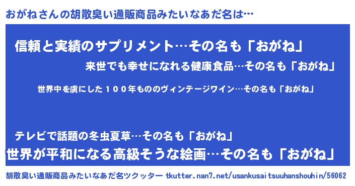 | 男性向けラノベタイトル風あだ名 | 『魔弾の王とおがね』『オガネスレイヤー』 |