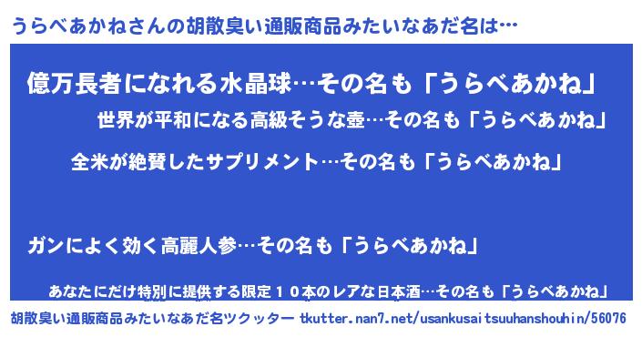 | 男性向けラノベタイトル風あだ名 | 『うらべあかねに滅ぼされるだけの簡単なお仕事です』 |