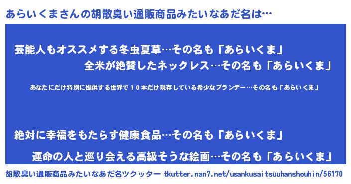 | ヒーロー風カッコイイあだ名 | 『仮面アラダー』『究極戦士アライクマ』 |