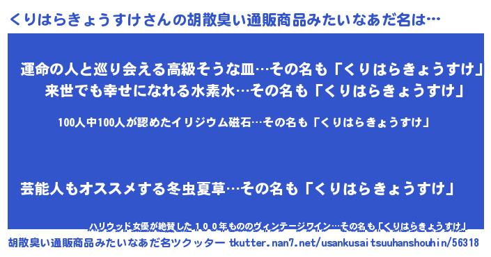 | 男性向けラノベタイトル風あだ名 | 『はたらくくりはらきょうすけさま!』 |