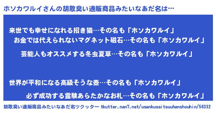 | ヘコむあだ名 | 『ホソカワルイ(震え声)』『ホソにゅー』 |