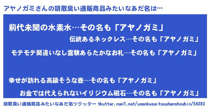 | ヘコむあだ名 | 『アヤっふぃ~』『アヤノガミ(遠い目)』 |