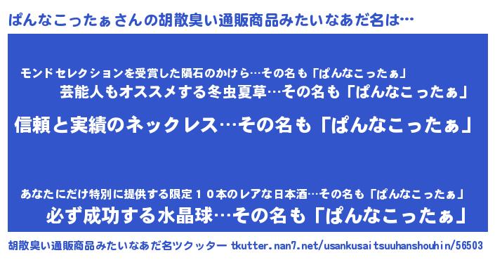 | 女子向けラノベタイトル風あだ名 | 『ぱんなこったぁは平凡を望む』 |