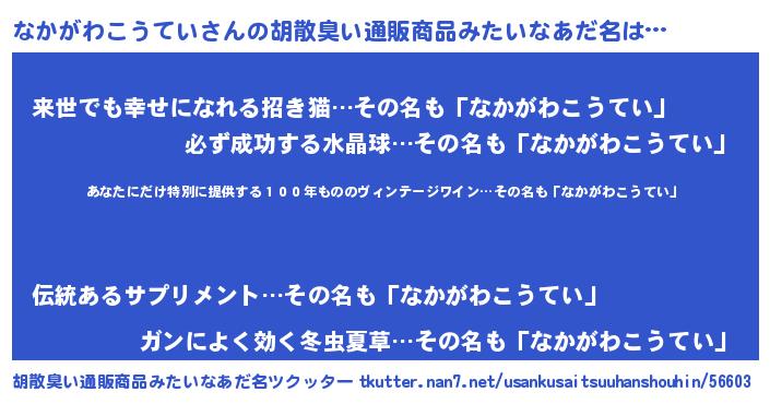 | ヘコむあだ名 | 『なかがわこうてい(笑)』『なかふぇ~』 |