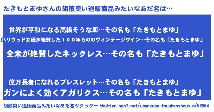 | 男性向けラノベタイトル風あだ名 | 『たきもとまゆの嫁は女の子じゃないと思った?』 |