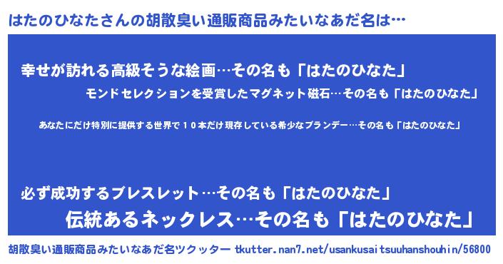 | 意味不明あだ名 | 『住所不定無職はたのひなた(71歳)』 |