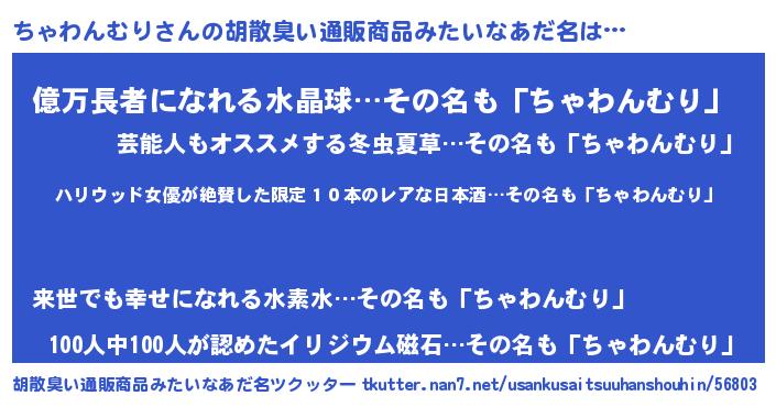 | 意味不明あだ名 | 『住所不定無職ちゃわんむり(41歳)』 |