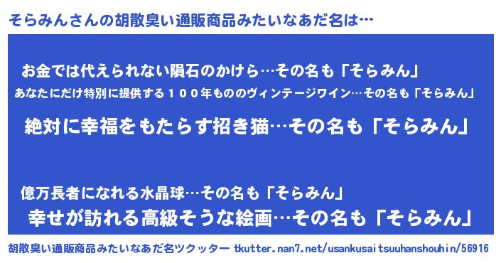 | 意味不明あだ名 | 『永久保存そらみん』『ペロリンそらみん』 |