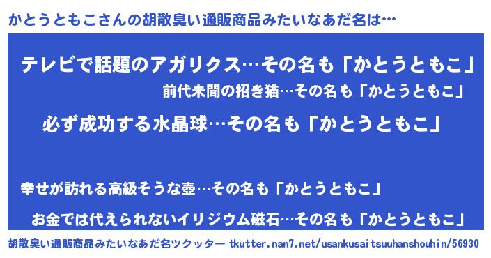 | 男性向けラノベタイトル風あだ名 | 『かとうともこの憂鬱』 |