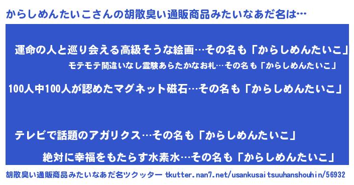| 男性向けラノベタイトル風あだ名 | 『おまえをオタクにしてやるから、俺をからしめんたいこにしてくれ! 』 |