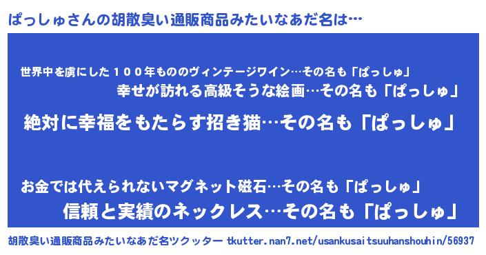 | 男性向けラノベタイトル風あだ名 | 『ぱっしゅという概念が存在しない退屈な世界 』 |