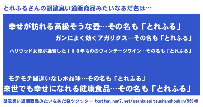 | 男性向けラノベタイトル風あだ名 | 『魔弾の王ととれふる』『とれふるの憂鬱』 |