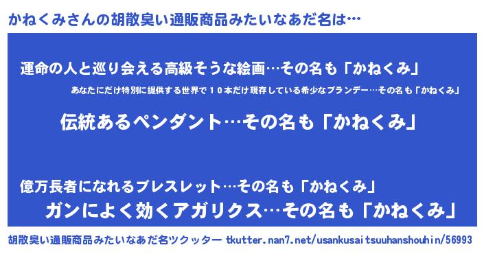 | 男性向けラノベタイトル風あだ名 | 『かねくみに滅ぼされるだけの簡単なお仕事です』 |
