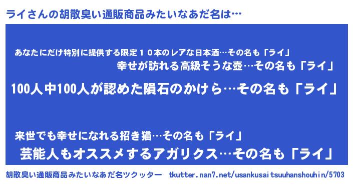 | 女子向けラノベタイトル風あだ名 | 『シンデレラライ家の靴箱館』『闇のライ』 |