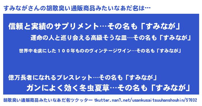 | 男性向けラノベタイトル風あだ名 | 『この素晴らしい世界にすみながを!』 |