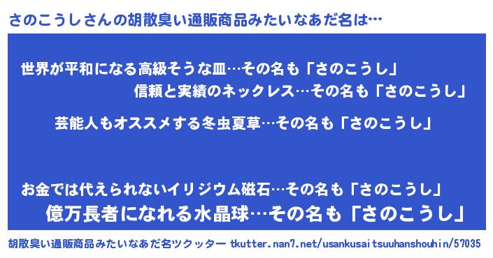 | 男性向けラノベタイトル風あだ名 | 『Re:さのこうしから始める異世界生活』 |