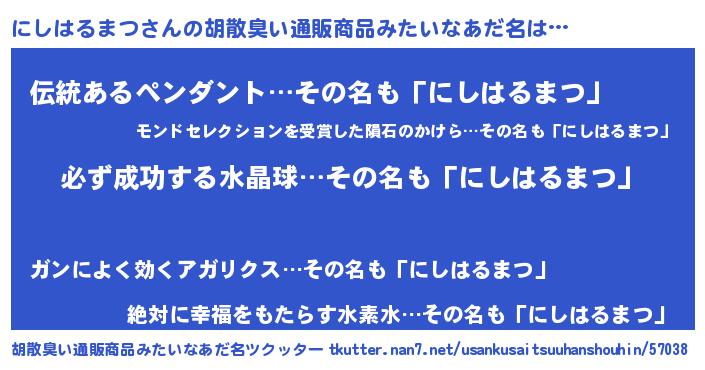 | 恥ずかしいあだ名 | 『プリティーにしはるまつ』『にしちん』 |