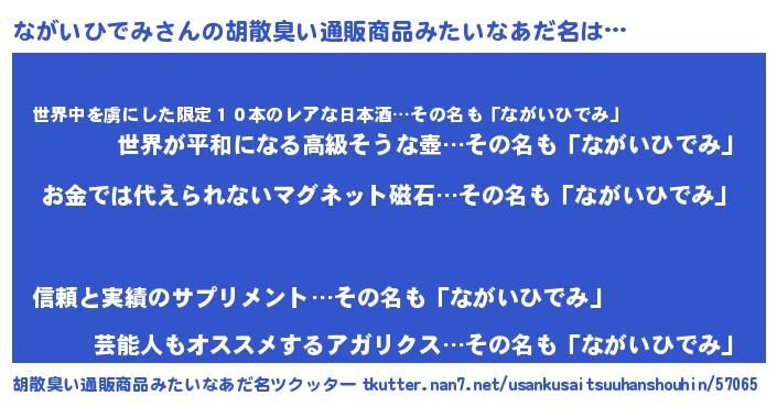 | 男性向けラノベタイトル風あだ名 | 『おまえをオタクにしてやるから、俺をながいひでみにしてくれ! 』 |