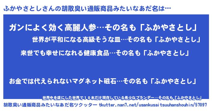 | ヘコむあだ名 | 『ふかやさとし(笑)』『豆乳』 |