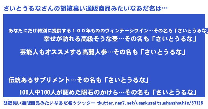 | 意味不明あだ名 | 『自称さいとうるな』 |