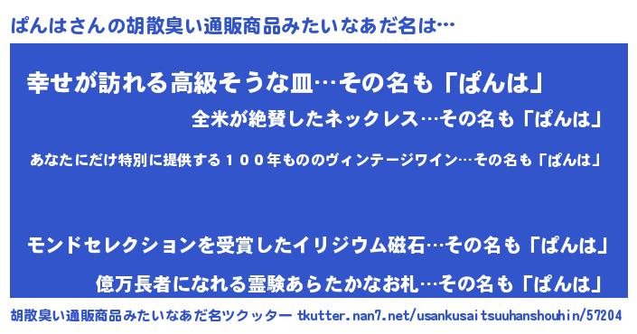 | 男性向けラノベタイトル風あだ名 | 『この素晴らしい世界にぱんはを!』 |
