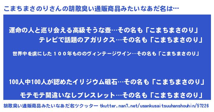 | 男性向けラノベタイトル風あだ名 | 『この素晴らしい世界にこまちまさのりを!』 |
