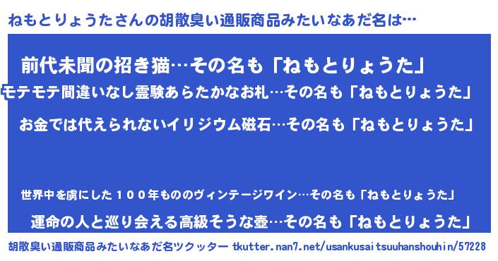 | 男性向けラノベタイトル風あだ名 | 『おまえをオタクにしてやるから、俺をねもとりょうたにしてくれ! 』 |