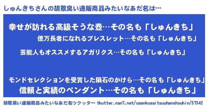 | 意味不明あだ名 | 『自称しゅんきち』『ペロリンしゅんきち』 |