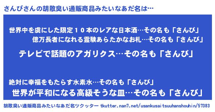 | 意味不明あだ名 | 『自称さんび』『住所不定無職さんび(11歳)』 |