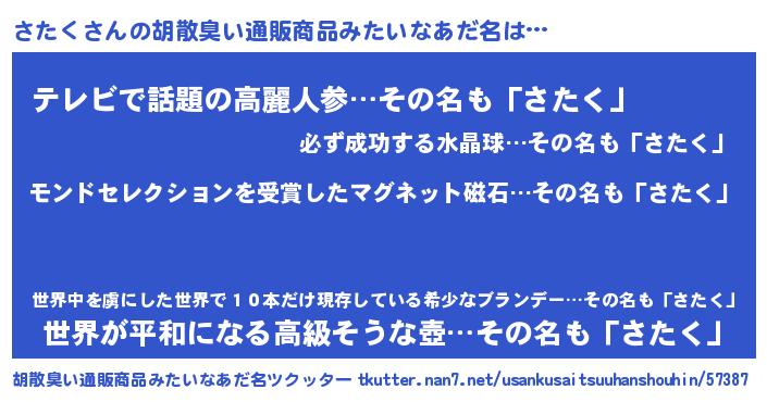| 男性向けラノベタイトル風あだ名 | 『さたくに滅ぼされるだけの簡単なお仕事です』 |