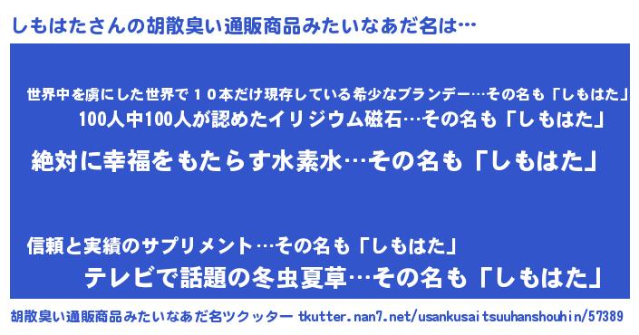 | ヘコむあだ名 | 『しもはた(遠い目)』『しもぷりん』 |