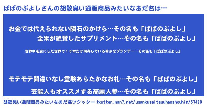 | 意味不明あだ名 | 『住所不定無職ばばのぶよし(81歳)』 |