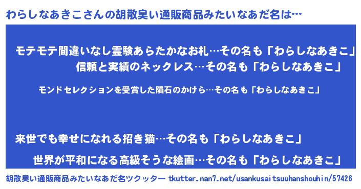 | 男性向けラノベタイトル風あだ名 | 『ノーゲーム・ノーワラシナアキコ』 |