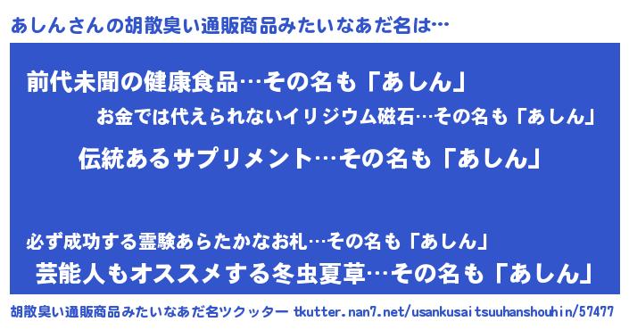 | 意味不明あだ名 | 『とにかく怪しいあしん』『自称あしん』 |